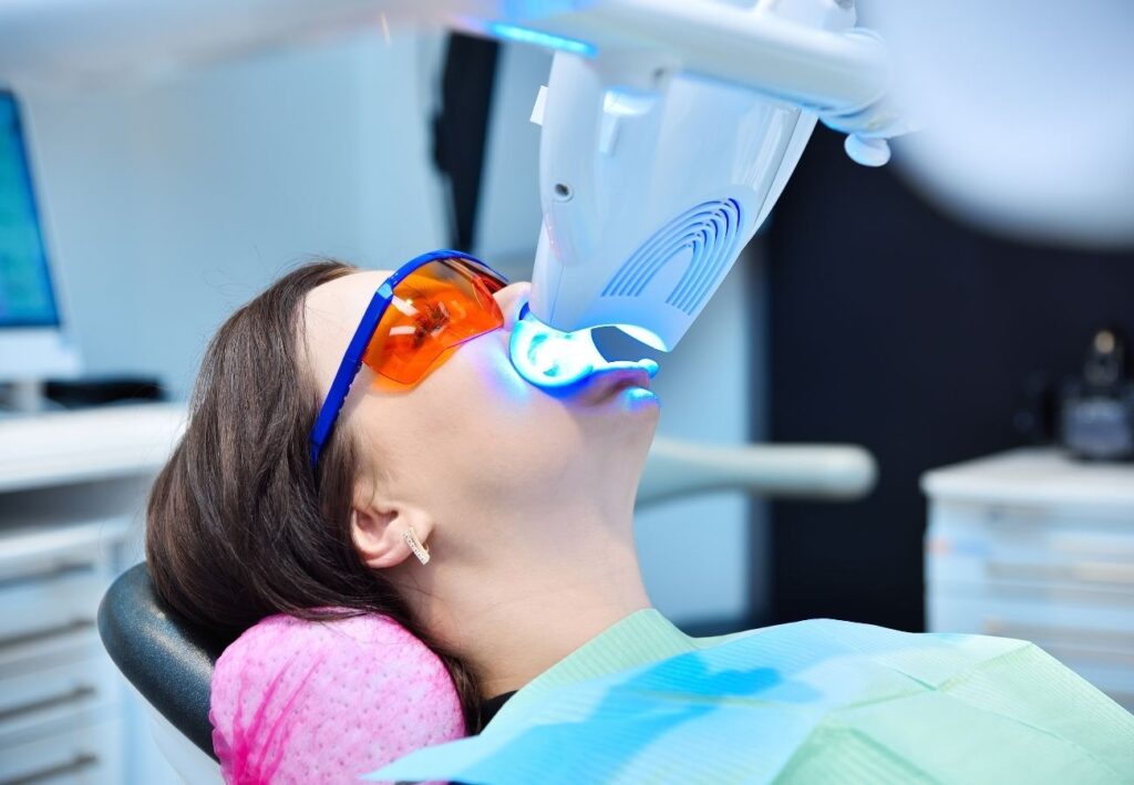 Il trattamento con laser prevede l’applicazione di gel sbiancante attivato da una luce laser che ne potenzia l’efficacia.